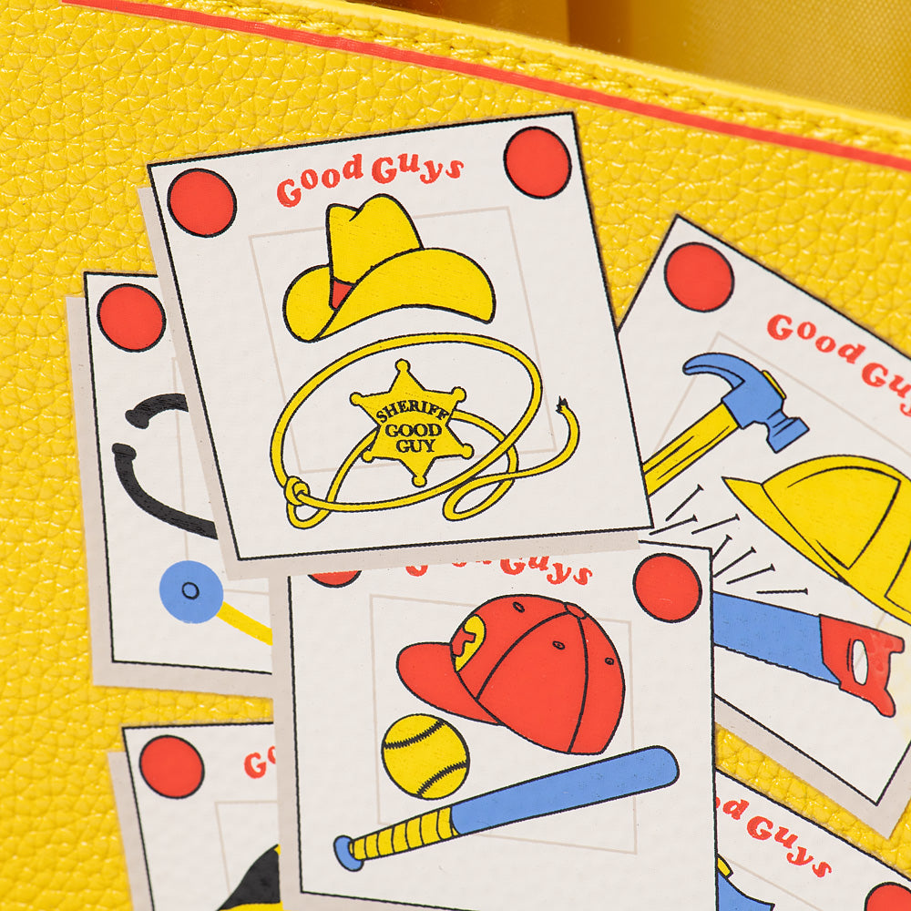 The Chucky Loungefly Tote Bag brings killer style to your everyday carry! Designed in bold yellow inspired by the Good Guys toy box, it features playful Chucky artwork and is perfect for horror fans who want their accessories as mischievous as their favorite doll.