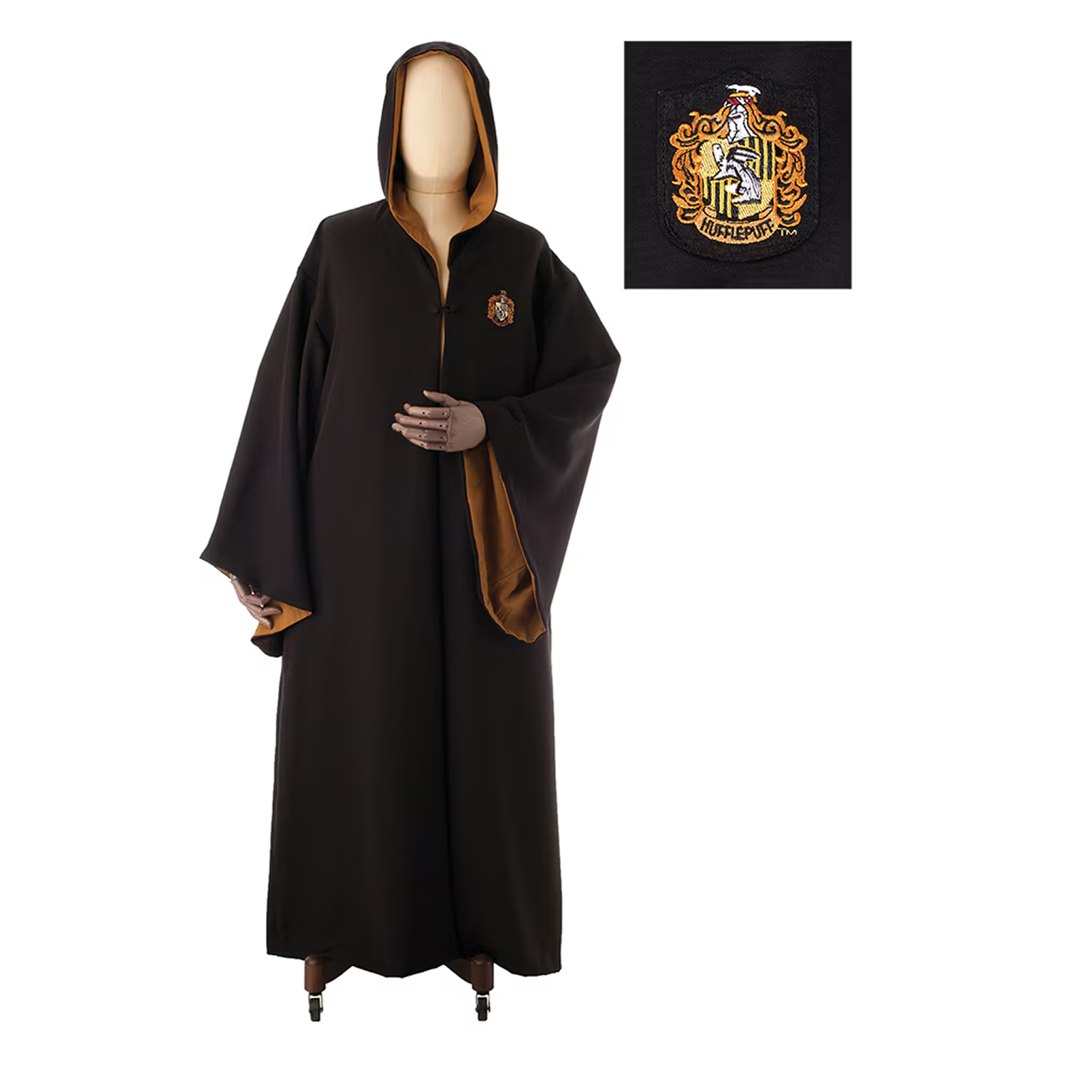 This authentic Hufflepuff robe has contrasting yellow lining, pockets and an embroidered patch of the house crest.