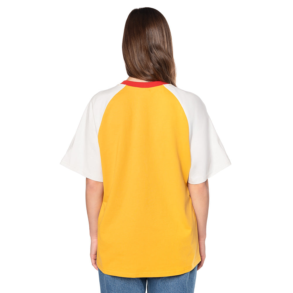 The Birds™ Raglan T-Shirt blends vintage baseball style with classic Hitchcock™ design, featuring contrasting sleeves and distressed artwork inspired by the film.